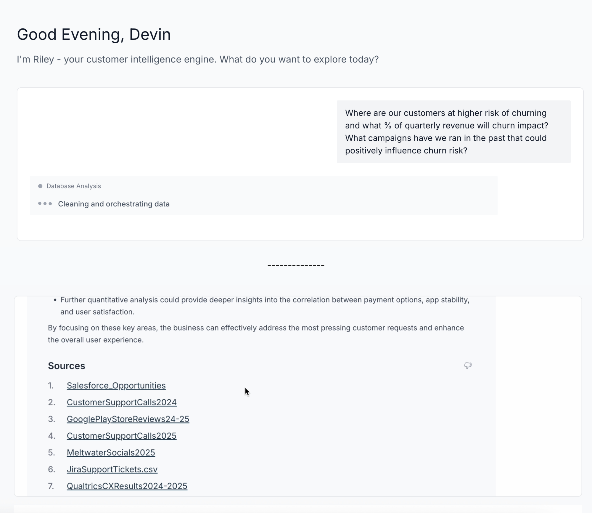 Ask any questions about your data in any language and Riley finds the answers for you. Yes - this includes the hard ones like “Where are our customers at higher risk of churning and what % of quarterly revenue will churn impact?”